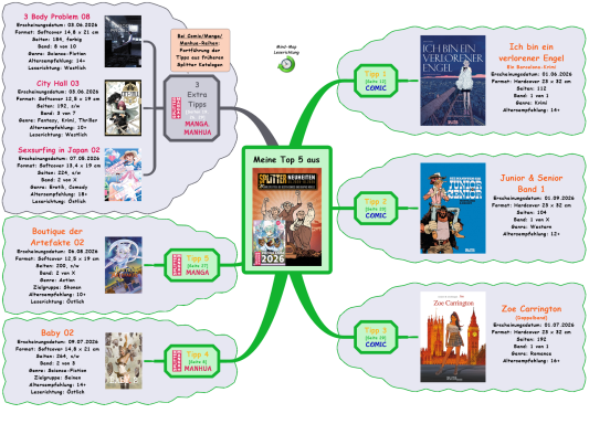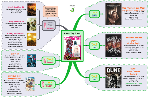 Top 5 Comic / Manga / Manhua Empfehlungen aus jedem Splitter Katalog dargestellt als übersichtliche Mind-Map.