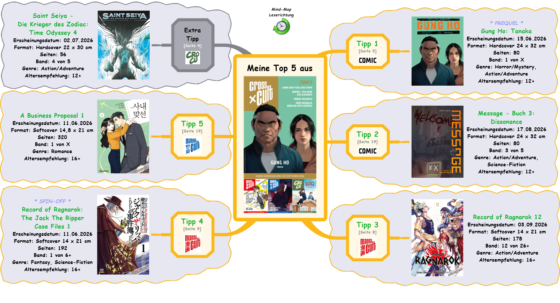 Top 5 Comic / Manga / Manwha Empfehlungen aus jedem Cross Cult Katalog dargestellt als übersichtliche Mind-Map.